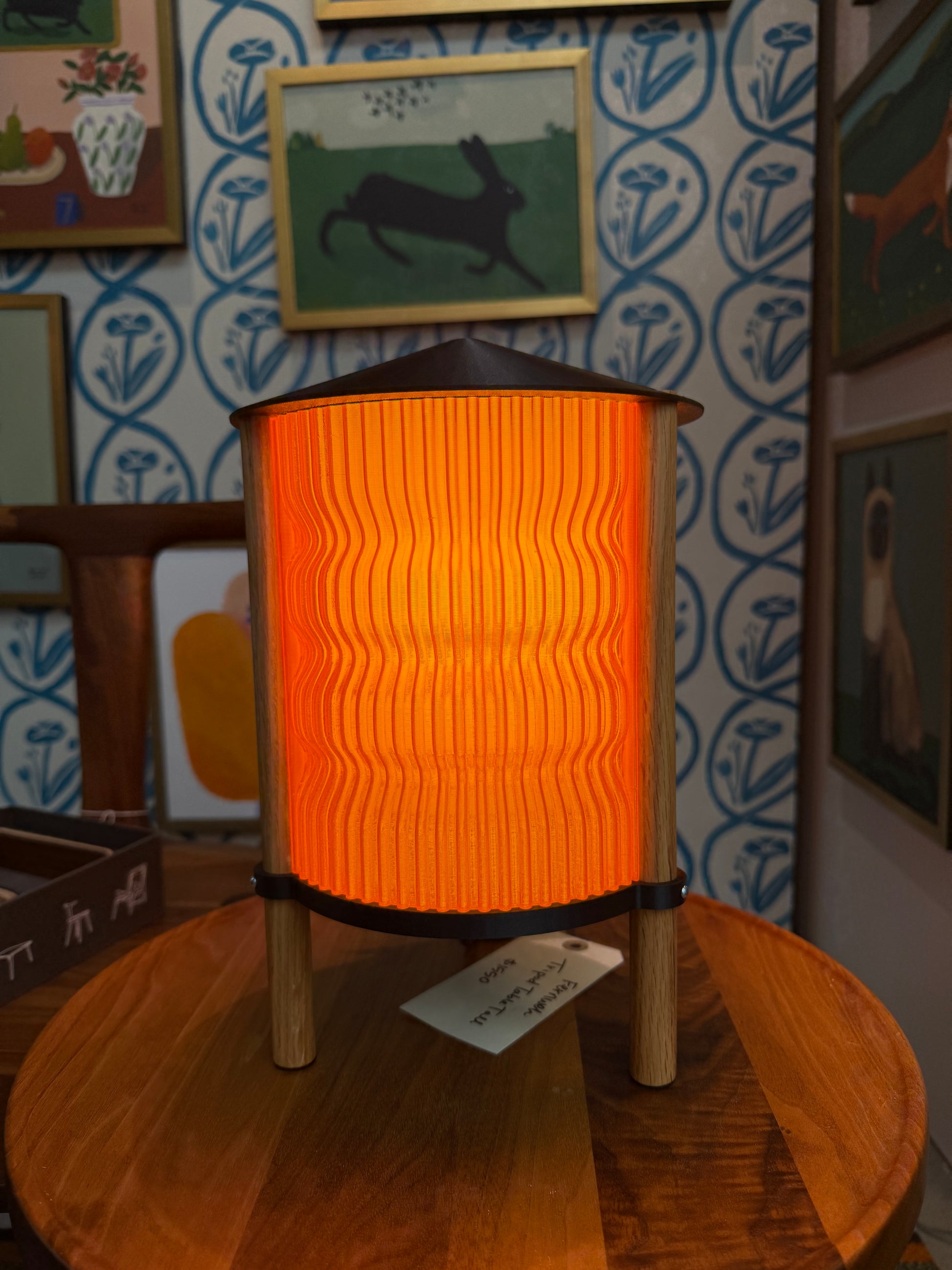 This unique lamp stands proudly on three sturdy wooden legs, offering a sleek and minimalist design that adds warmth and character to any room. Its translucent shade gently diffuses light, creating a soft, inviting glow that complements the warm bulb within.